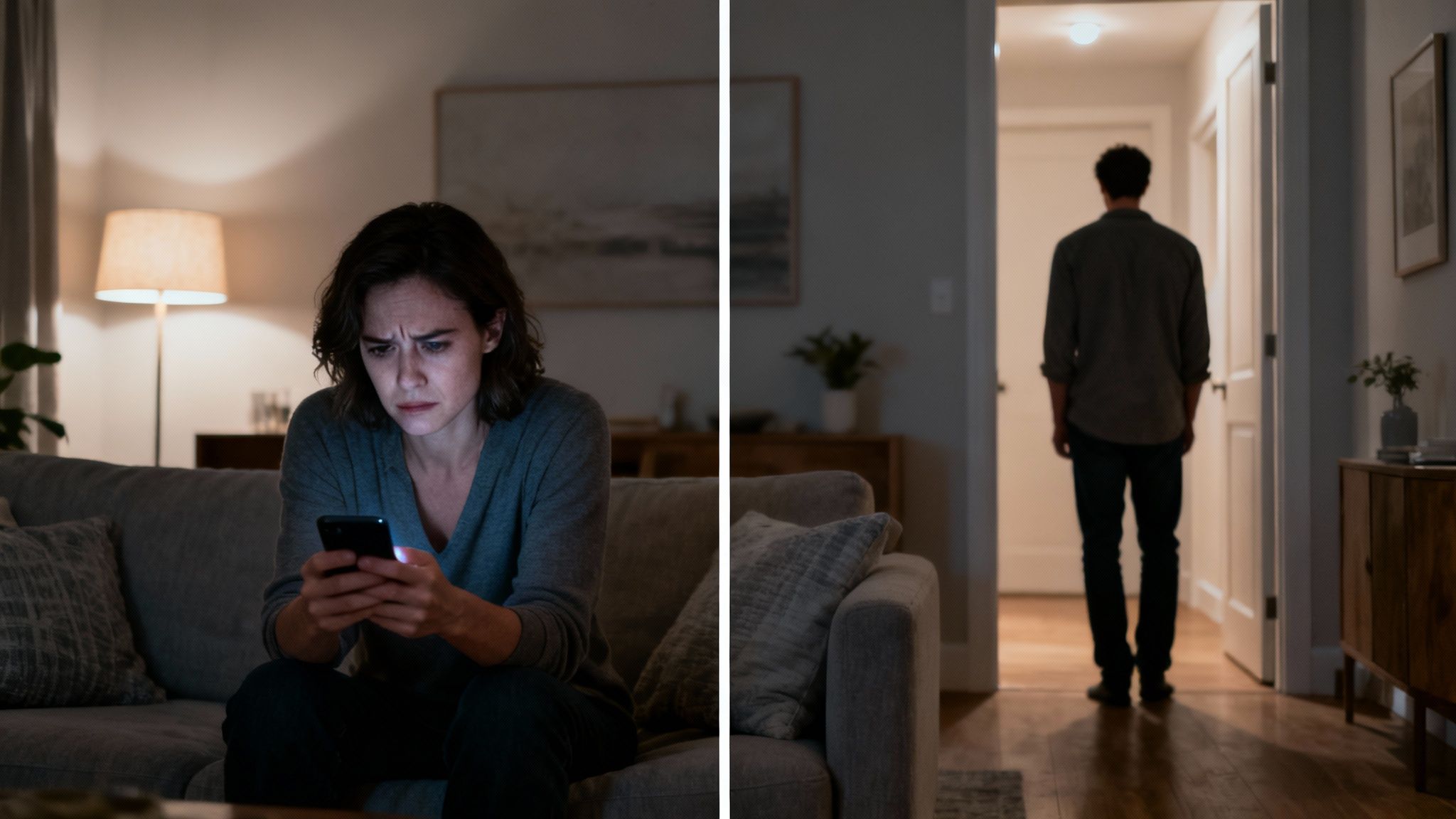 Suddenly, he’s “swamped” at work. He cancels their midweek dinner plans, saying he just needs some space to recharge.