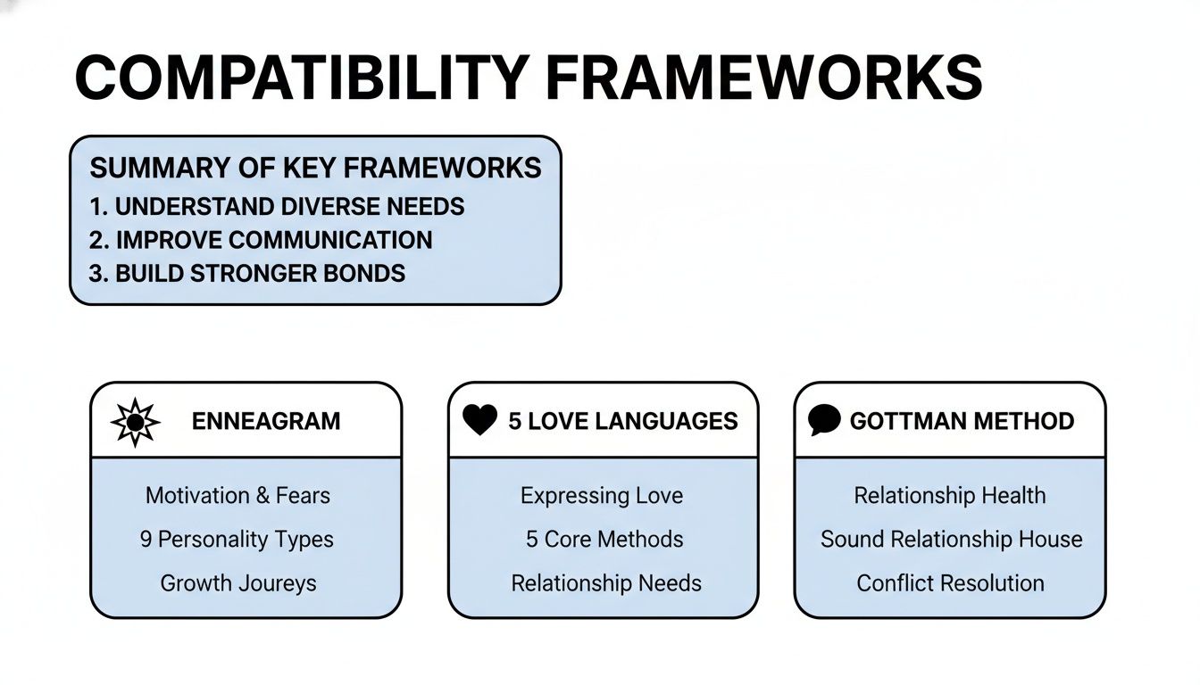 Finding the right free compatibility test for couples is a lot like picking the right tool for a project. You wouldn't use a sledgehammer to hang a picture frame, right? Each of these frameworks offers a totally different lens to look at your relationship, highlighting unique parts of your shared life. Let’s break down the big three so you can find the perfect fit for where you and your partner are right now.