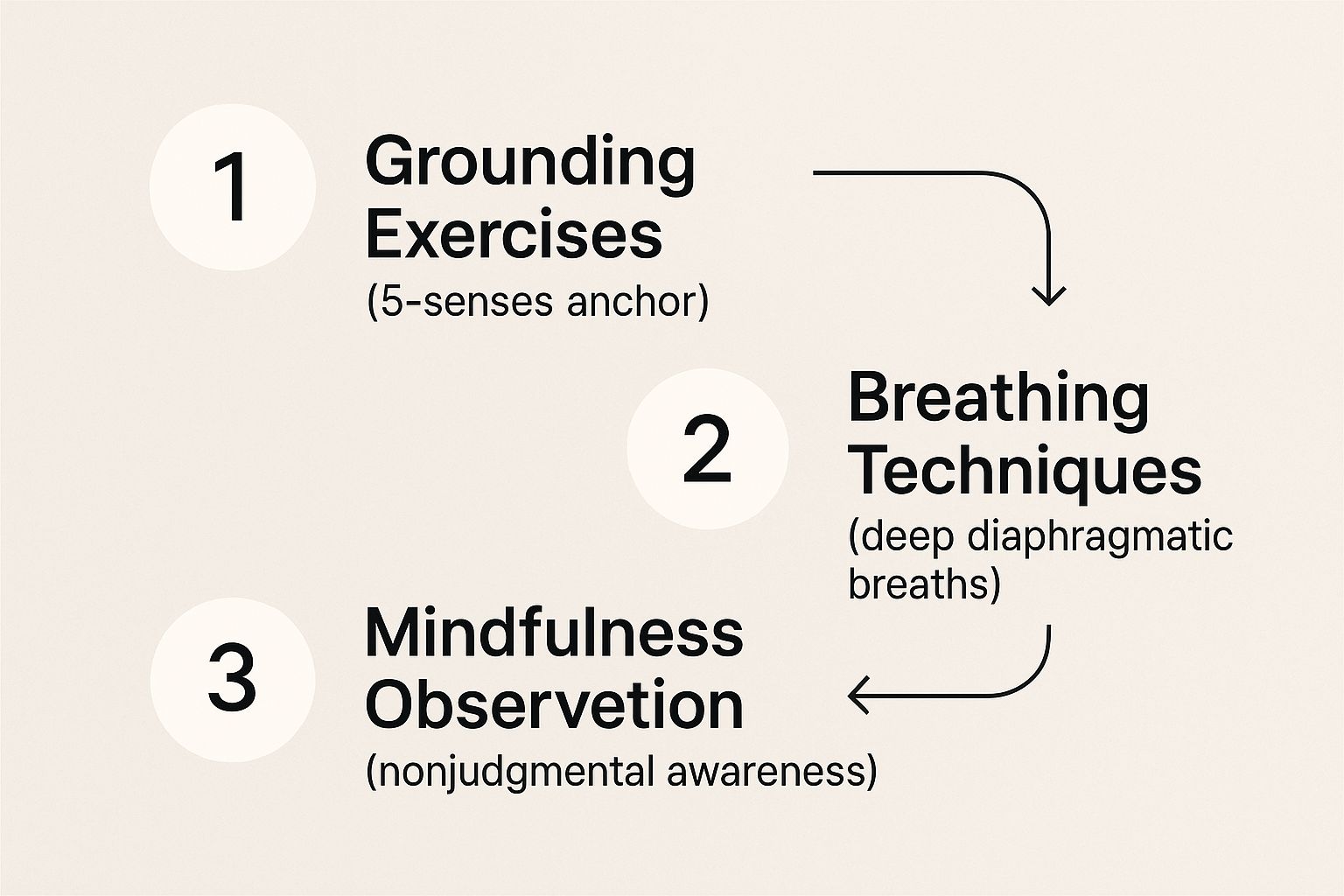 The infographic below shows how these pieces—grounding, breathing, and mindful observation—work in harmony.