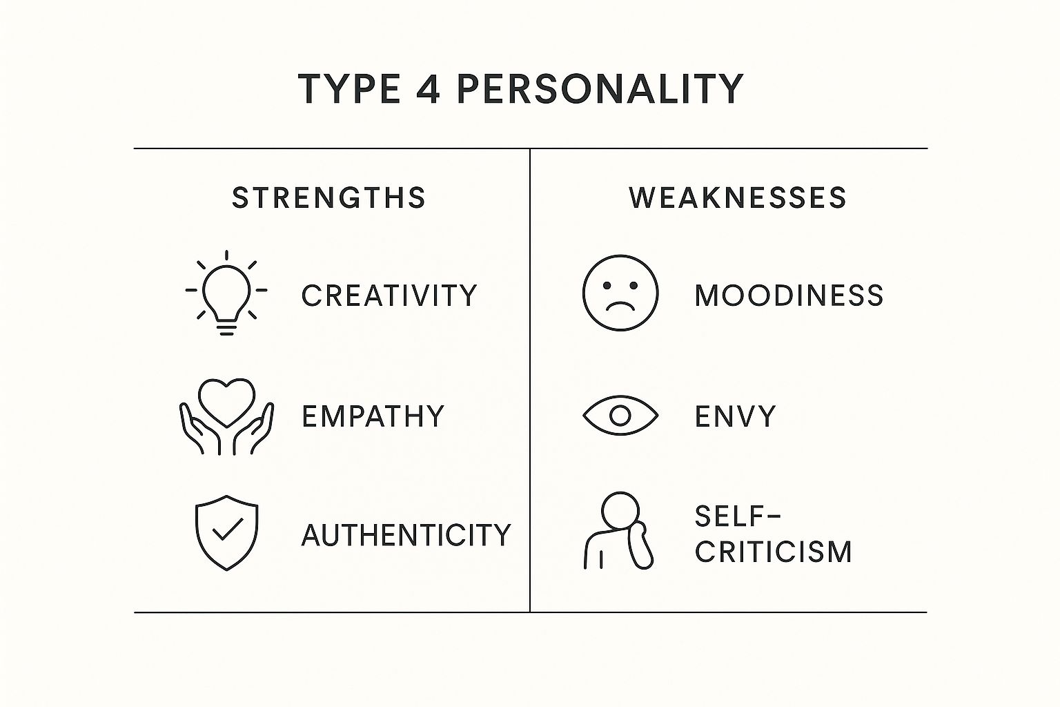 This infographic gets to the heart of what all Type 4s are working with, regardless of their wing. It shows how their greatest strengths, like creativity and empathy, are two sides of the same coin as their biggest challenges, like moodiness and a brutal inner critic.