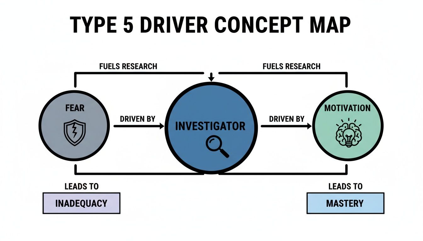 This whole pattern of hoarding knowledge, time, and energy is a brilliantly designed defense mechanism. Fives build a fortress of competence around themselves to stay safe from a world they experience as unpredictable and draining. Getting a handle on these core drivers is the first step to truly appreciating the unique inner world of the Investigator. You can dive even deeper into what makes each type tick by exploring all the Enneagram core motivations in our detailed guide.