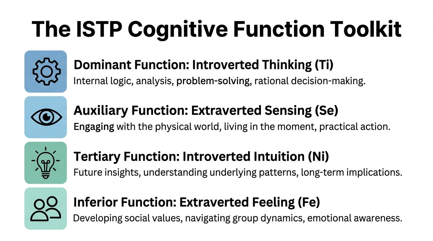 In plain English, ISTPs tend to lead with analysis, back it up with real-world data, add a quiet forecasting streak, and bring social smoothing in last. That order matters. It explains why an ISTP can solve a mess in five minutes and still sound awkward while explaining the fix.