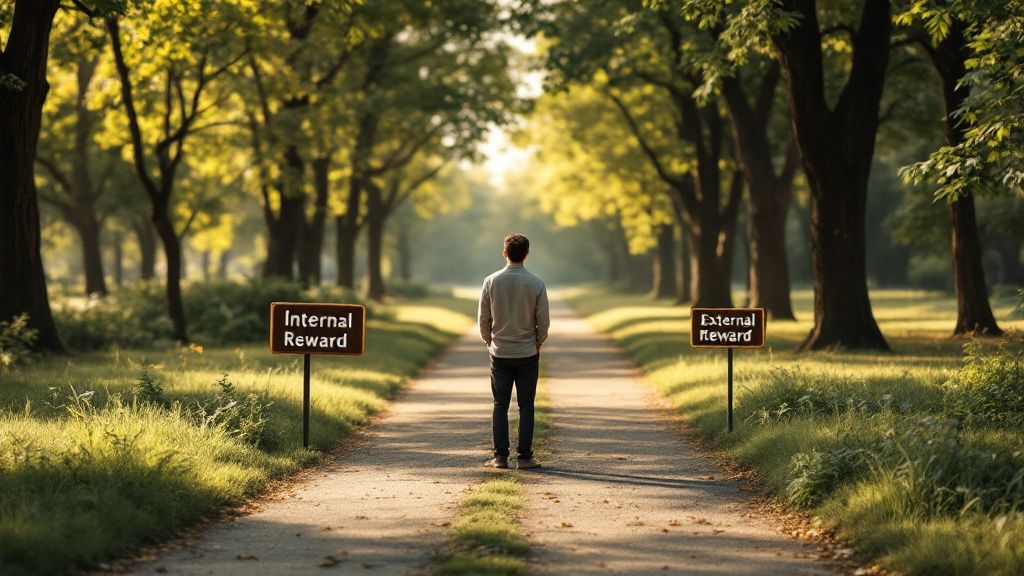 So, what really is intrinsic motivation? Think of it as your own personal compass, always pointing toward what genuinely fulfills you. This is a world away from its counterpart, extrinsic motivation, which is more like an external map handed to you by someone else, marking the spots where you can find a reward—a paycheck, a gold star, or a round of applause.